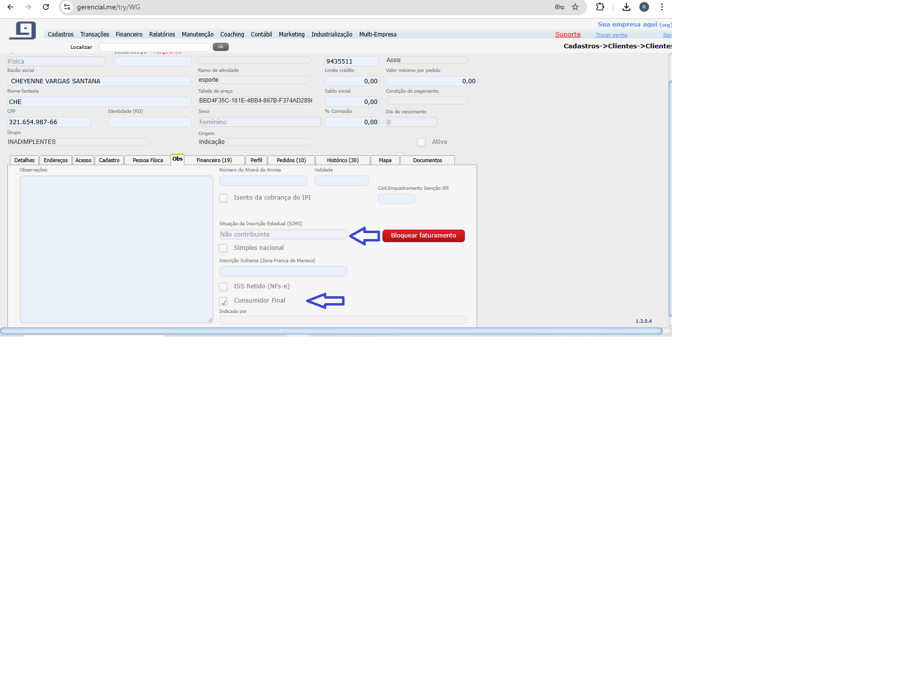 1.5) Se já tiver cadastrado o IE. Verifique se no cadastro do cliente, aba OBS esta marcado como Consumidor Final.
